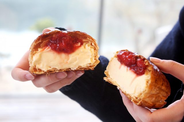 地産品のヒラヤミルクと新鮮な卵を使用した「ミルクカステラ」、黒い玄武岩をイメージした「黒糖カステラ」と「抹茶カステラ」の3種類です。キラキラした結晶のようなザラメが上にのっています。